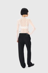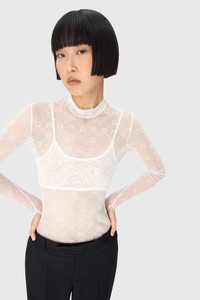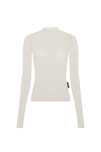- Signature Moonogram flocked all over - Extra long sleeves with thumb holes - Branded label woven on left side seam Materials Moonogram Mesh Flock White The Moonogram motif is flocked with soft velvet on our recycled mesh jersey, creating an incredibly comfortable fabric. The mesh’s transparency calls back to Marine Serre’s transgressive vision by having a material traditionally used solely for lingerie reimagined as day-to-day wear. 86% Polyamide - Recycled (GRS Certified), 14% Elastane