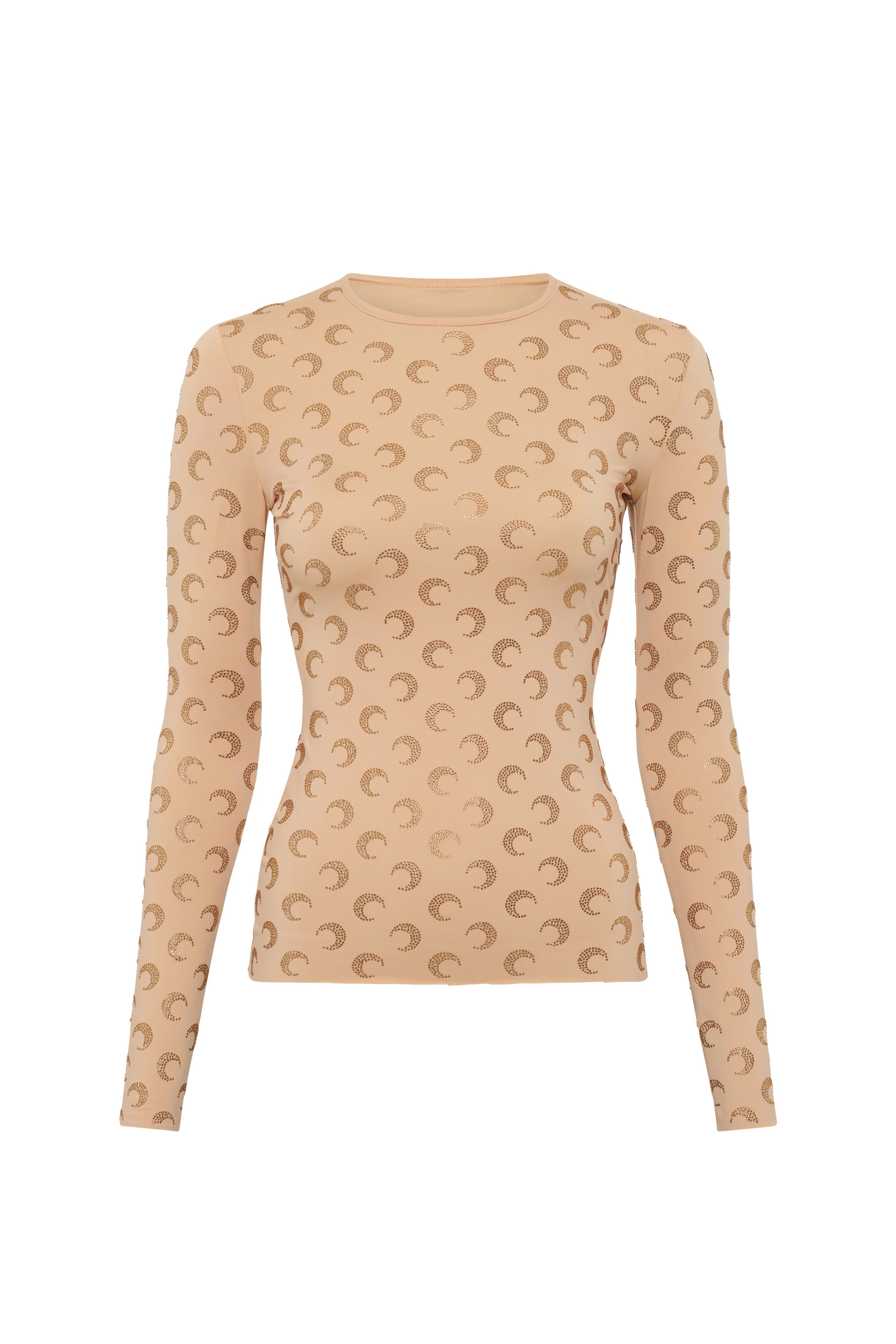 - Signature Moon rhinestoned all over - Reinforced neckline - Cuffs and hem finished with raw edges Materials RECYCLED MOON STRASS JERSEY The Rhinestoned All Over Moon print was first unveiled via a special couture catsuit during our Rising Shelter show (F/W 2023). Since then, the house has been busily working on research and development with the idea of translating the print to our ready-to-wear line. To this end, especially for this project, the team has forged ties with an artisanal workshop in India that specializes in the luxurious artisanal craft of embellishment; venturing into this partnership is very much in line with our ongoing support for superb craftmanship and our wish to embrace fashion with a rich story and heritage. Amazingly, it can take an artisan between eight and ten hours just to finish a single garment in this range, as each rhinestone must be fixed by hand and there are hundreds of rhinestones adorning each piece. The fabric used on the tops, catsuit and leggings in this line is the same recycled jersey which features in our other second-skin lines. 88% Polyamide (GRS Certified) - Recycled, 12% Elastane