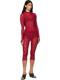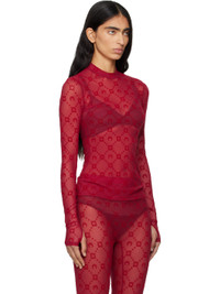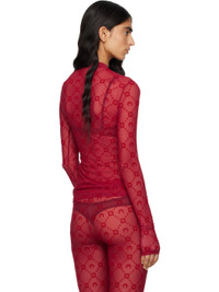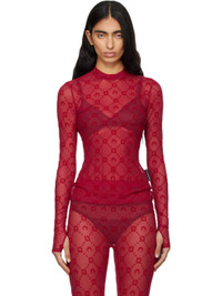 Sheer stretch recycled nylon mesh T-shirt. · Flocked logo pattern printed throughout · Mock neck Supplier color: Ribbon red 86% recycled polyamide, 14% elastane. Made in France 252020F110046