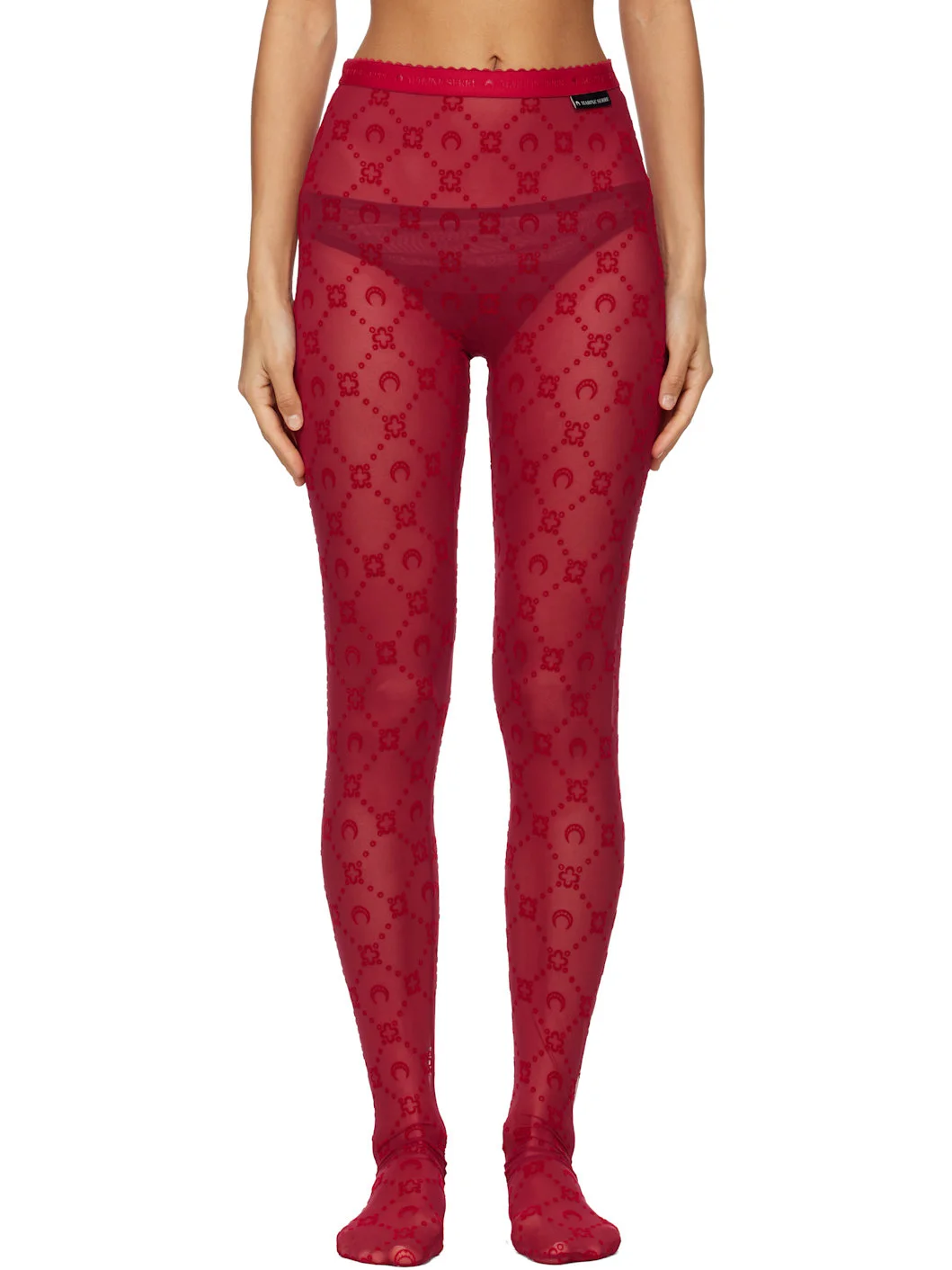 Sheer stretch recycled nylon mesh tights. · Logo pattern flocked throughout · High-rise · Scalloped edge at logo-woven elasticized waistband · Logo flag at front Supplier color: Moonogram flock mesh ribbon red 86% recycled polyamide, 14% elastane. Made in France 252020F076005