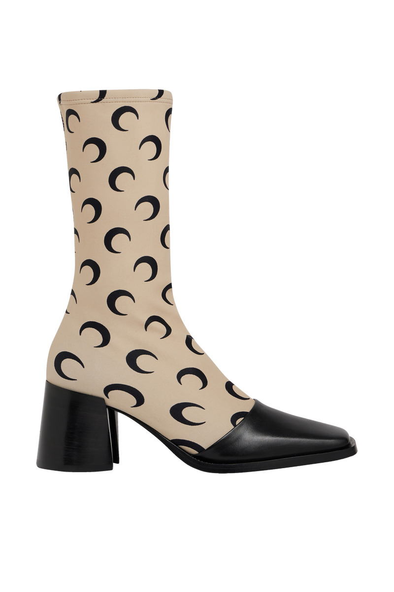 These regenerated ankle boots, crafted from recycled jersey fabric, feature the signature All Over Moon print, adding a bold statement to any outfit Materials All Over Moon Tan on Black Jersey Second skin regenerated fabric, made from recycled jersey (GRS certified) are always presented in the Marine Serre collections. 78% Recycled Polyamide 22% Elastane