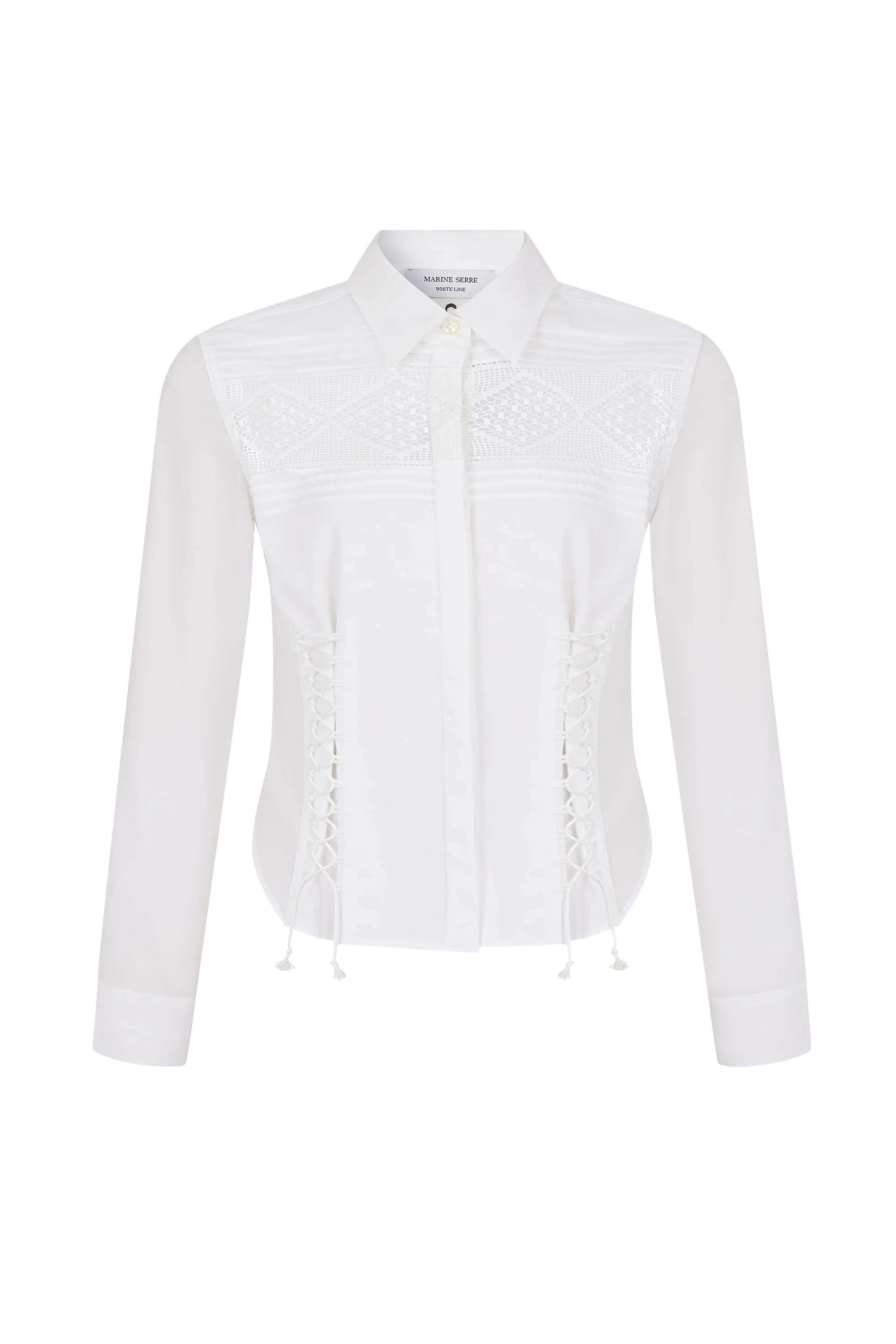 - French collar - MARINE SERRE initials embroidery on upper back - Fabric insert on back in a Moon and Sun Diamond stretch jacquard - Corset drawstrings on either side - Double buttoned cuffs - Darted back Materials Household Linen White Material : Pillowcases From & Date of Sourcing : UK, 1960s Place of Transformation : France This extraordinary fabric is part of the core materials of the House. The forgotten techniques of the upcycled embroidered household linen are saved from oblivion and regenerated into unique, transcending garments evoking soft, delicate and sensual imagery. All these one-of-a-kind pieces are filled with history through their embroideries, all smoothly placed to highlight the beauty of this rare fabric. The white tones of the pillowcases are also dyed in black to play with the ceremonial references. 100% Cotton