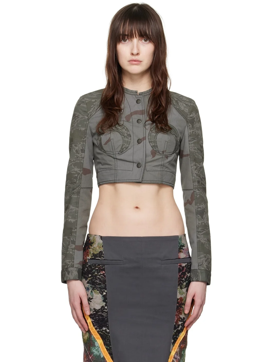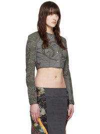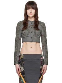 Polyester- and cotton-blend ripstop jacket. Camouflage pattern printed throughout. · Paneled construction · Raw edge at crewneck · Press-stud closure · Padding at cups · Cropped hem · Press-stud cuffs · Logo patch at back collar · Partial cotton twill lining · Logo-engraved antiqued silver-tone hardware · Contrast stitching in black Part of the Gold Line collection. Supplier color: Dark grey