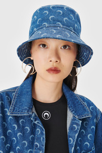 Sweat band lining with MARINE SERRE brand label stitched on it MARINE SERRE ribbon lining interior fusing Adjustable strap with MARINE SERRE branded buckle All Over Moon laser print over cap Materials Deadstock Denim MARINE SERRE is a storyteller, disassembling and reassembling this popular material exclusively from 100% cotton denim pants to create one-of-a-kind regenerated pieces, each revealing new unique stories. 100% Cotton