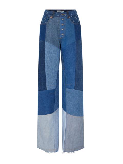 Medium-waisted straight leg long denim pants Product Detail - Zipper and button - Two zipped front pockets - Two back pockets - Belt loops - Signature moon laser printed all over on sides panels - Cotton twill on front pockets - Marine serre leather patch Composition and Traceability Product details page relating to environmental qualities or characteristics WPA168A_UDEN0012_BG01_LIGHT_SAND Composition: Main fabric - 100% cotton, Second fabric - 100% cotton Third fabric - 100% lamb leather, Lining - 100% cotton Product Care: Professional leather cleaning only Traceability: Weaving/Dyeing: Italy Manufacturing: France