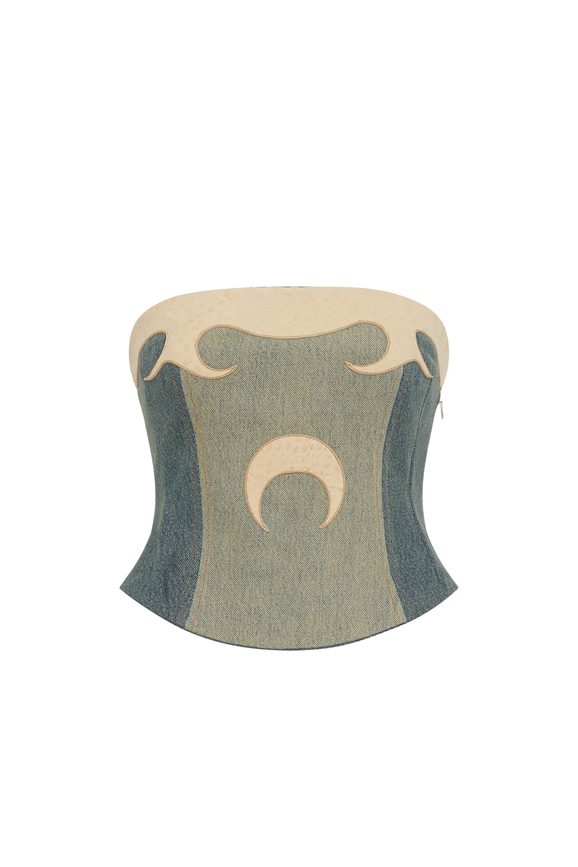 - Drawstring closure with metal end cord on center back - Jersey inserts in front and back seams allow extra fittedness - Western embossed crocodile leather - Upcycled denim jeans panelled construction Materials Regenerated Denim This hallmark fabric for the house embodies Marine Serre’s role as a modern-day storyteller, spinning new narratives from carefully sourced jeans that are then sorted, sand-washed, cut and regenerated into one-of-a-kind couture garments. These artisanal, upcycled pieces feature reptile-effect textured leather details, lending them an organic feel. At the same time, variations in hue arising from the different kinds of denim deployed create pleasing tone-on-tone effects. There’s a playful and self-referential quality to the leather details, which assume the form of curves, flames or even, in some cases, curl around to adopt the contours of the Marine Serre Moon.