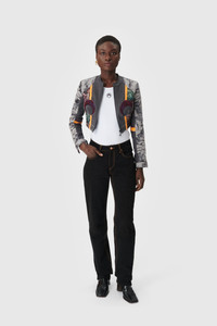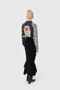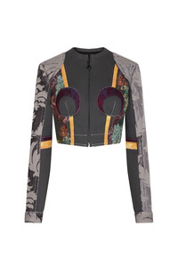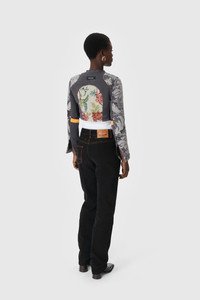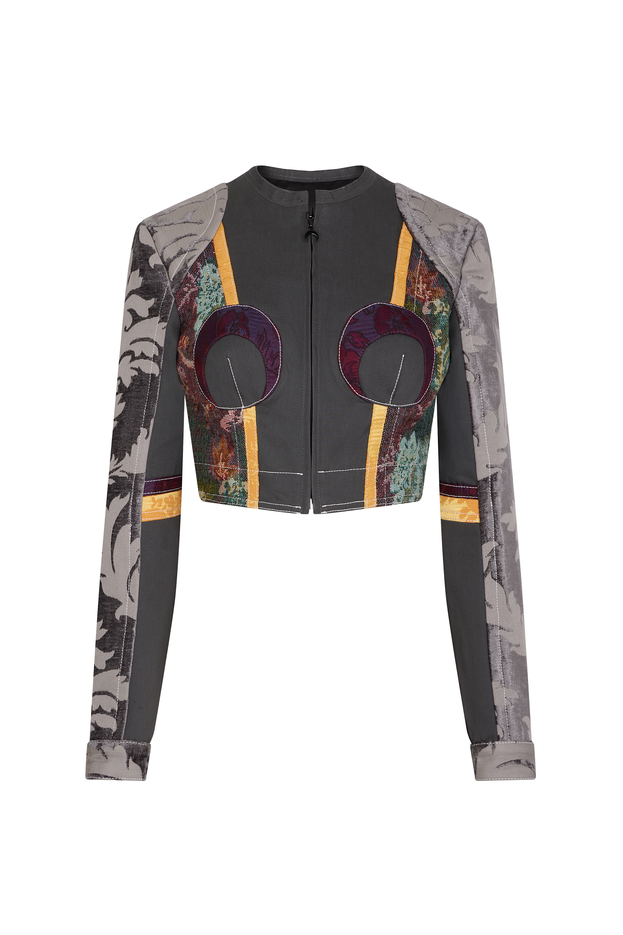 This unique cropped fitted jacket is crafted from upcycled deadstock fabrics, showcasing standout MOON detail incrustations on the chest. It features a raw edge collar, a hidden black zipper with an iconic MOON puller, a signature label, black jersey panels on the sides, one black button on each cuff, a patchwork of deadstock brocade fabrics, and off-white topstitches. Materials Regenerated Floral Tapestries This unique pattern is crafted from a patchwork of floral tapestry, using a blend of upcycled deadstock fabrics. 100% Cotton