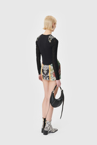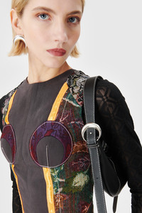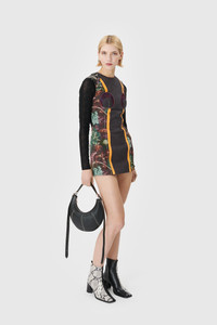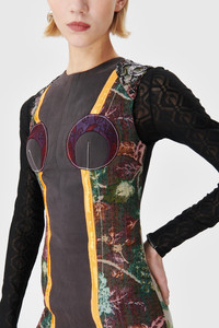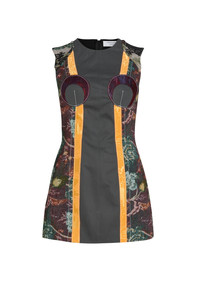 This unique sleeveless mini dress, constructed from upcycled deadstock fabrics, features a fitted silhouette with a round neckline. The back is made of black jersey and includes MOON details incrustations on the chest. It boasts an invisible zipper on the middle back, a signature label, a patchwork of deadstock brocade fabrics, off-white topstitches, and embroidered lace on the shoulders. Materials Regenerated Floral Tapestries This unique pattern is crafted from a patchwork of floral tapestry, using a blend of upcycled deadstock fabrics. 100% Cotton