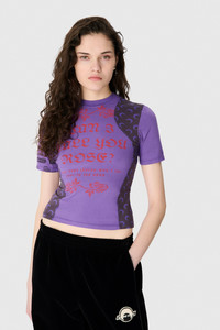 - Ribbed neckline - Printed ms regenerated logo - Upcycled t-shirts patchwork construction - Signature moon printed jersey cutouts on sides Materials Regenerated Aubergine Jersey Upcycled graphic t-shirts blend streetwear with feminine floral lace and recycled moon jersey inserts, each uniquely crafted. 100% COTTON