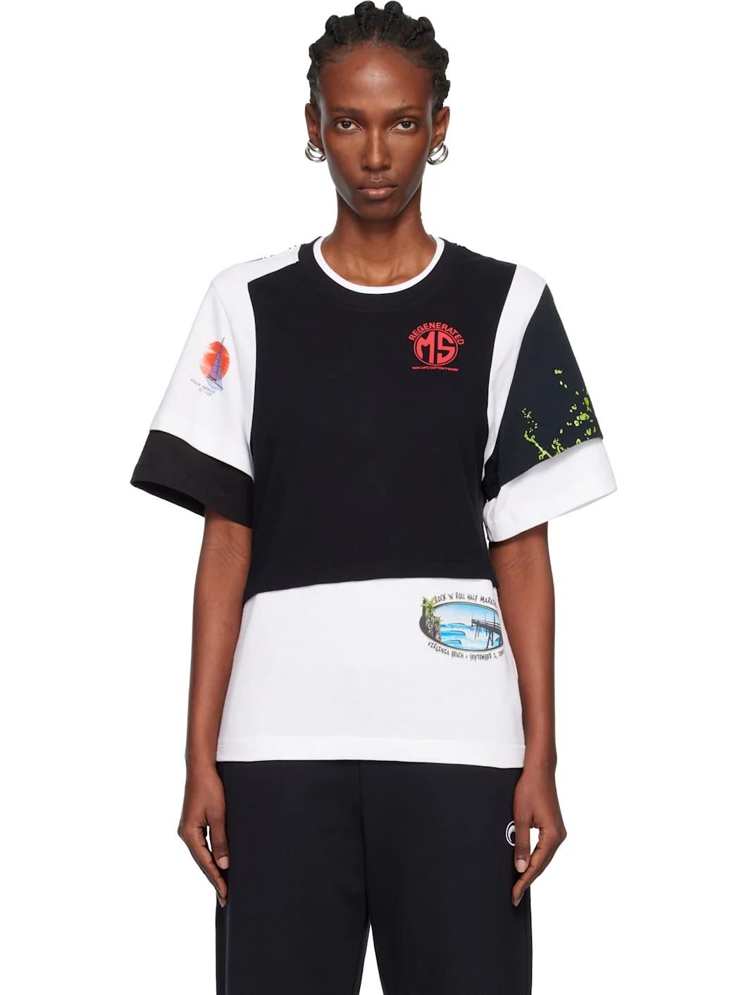Upcycled cotton jersey T-shirt. · Graphics printed throughout · Paneled construction · Rib-knit crewneck · Layered collar and cuffs · Logo printed at chest Each item is unique. Please note graphics may vary. Supplier color: White/Black Body: 100% cotton. Trim: 98% organic cotton, 2% elastane. Made in Portugal 252020F110061