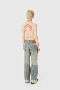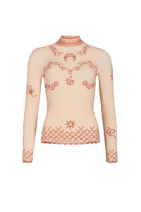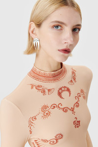 The Second Skin Top is a standalone basic and essential layering piece in the MARINE SERRE collection. Crafted from recycled fabric, this top highlights a high neck and long sleeves, while showcasing a henna-looking print for a distinctive look. Materials Henna Print Second Skin Made from recycled jersey, this fabric showcases a henna-inspired print, adding a unique touch to your wardrobe. It beautifully decorates the body, highlighting all types of silhouettes. 86% Polyamides, 14% Elastane