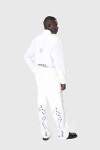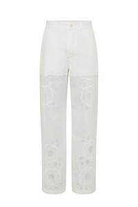 - Belt loops - Two italian side pockets - Lined upper - Upcycled household linen embroideries on bottom - Large hem - Lace branded patch embroidered on back pocket Materials Household Linen White Material : Pillowcases From & Date of Sourcing : UK, 1960s Place of Transformation : France This extraordinary fabric is part of the core materials of the House. The forgotten techniques of the upcycled embroidered household linen are saved from oblivion and regenerated into unique, transcending garments evoking soft, delicate and sensual imagery. All these one-of-a-kind pieces are filled with history through their embroideries, all smoothly placed to highlight the beauty of this rare fabric. The white tones of the pillowcases are also dyed in black to play with the ceremonial references. 100% Cotton