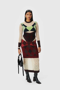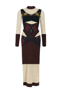 Crafted from 6 upcycled jumpers, this unique fitted dress features diamond-shaped motifs. It's designed with a slit at the bottom of the back for easy movement and makes a bold statement in your wardrobe. Materials Moon Diamant Mesh Beige This fabric, crafted from a biodegradable mesh blend and adorned with elegant Moonogram motifs throughout, adds a sheer, sensual layer. 70% Polyamide, 30% RIOCA Regenerated Lozenge Knit The exquisite sheer knit material is crafted from a fabric blend, offering a sheer and lightweight texture, perfect for elevating your style. 100% Wool