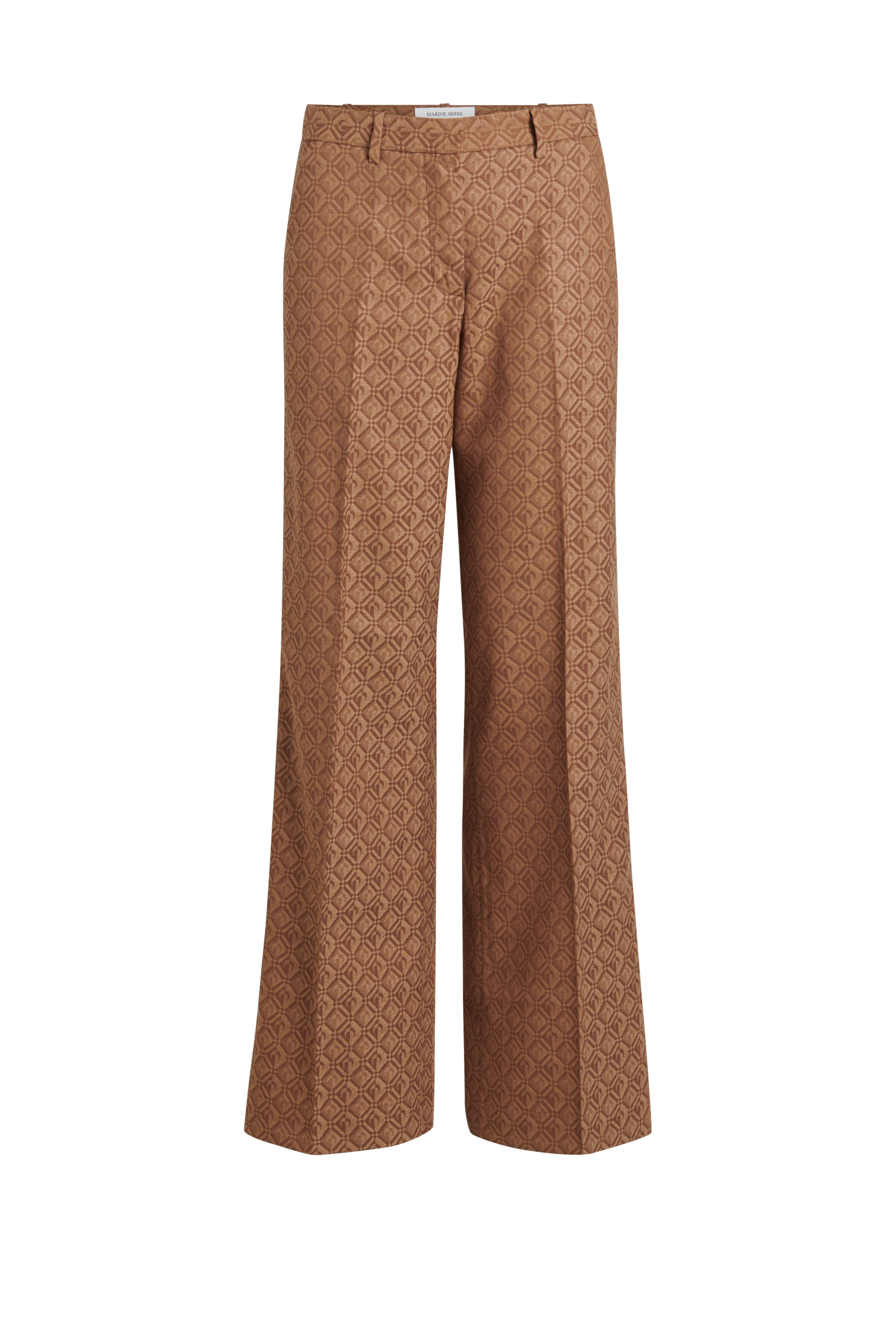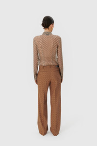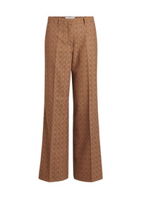 Crafted from recycled fabric, these unique pants, feature a tailored straight fit with contrasting topstitching, a zip-fly, and belt loops. Materials Moon Diamant Tailoring Brown The iconic pattern, adorned with moons shaped in diamonds from the MARINE SERRE collections, elevates the timeless silhouettes of formal attire. 55% Polyester, 43% Alpaca, 2% Elastane