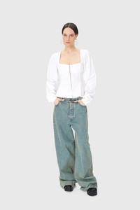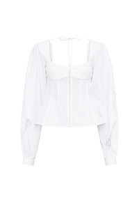 Adjusted fit corset blouse with open neck and puffy sleeves The discount percentage displayed on Last Chance products is calculated based on the product's original selling price before markdowns. Product Detail - Hook front closure - Buttoned cuffs - Tie closure in upper back - Upcycled household linen patchwork construction - Turned hem - Lace branded patch embroidered on waist Composition and Traceability Product details page relating to environmental qualities or characteristics WSI028A UWOV0007 WH10 WHITE Composition: 100% Cotton Traceability: Sourcing and upcycling country: France Manufacturing: Romania