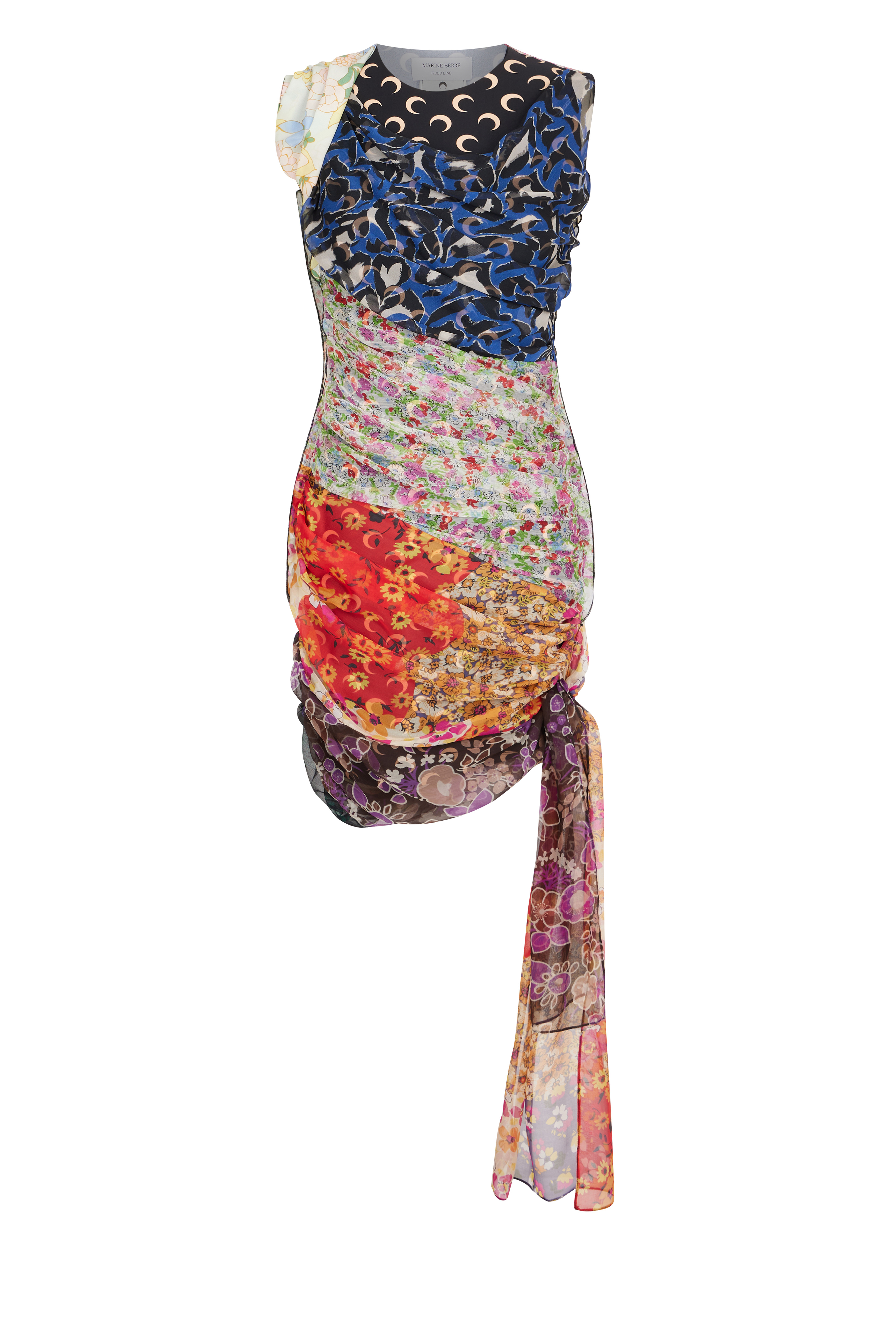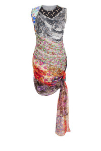 Regenerated from 12-14 upcycled silk scarves, this unique sleeveless draped dress features a neckline accentuated with topstitched white thread and an invisible zipper on the left side for easy wear. The application of the silk scarves leaves the seam allowance visible on the exterior, creating a beautiful finish with a baby lock stitch. Materials Silk Scarves Celebrating the beauty of clashing colors and vibrant prints, the brand’s preferred light material, is employed in its natural state this season, without dyes. The silk-based scarves, upcycled from deadstock, add a bold pop of color to the collection and result in unique pieces that evoke the most romantic side of the Marine Serre aesthetic. Matter: Multicoloured Silk Scarves 100% Silk, ca. 2000, sourced in France
