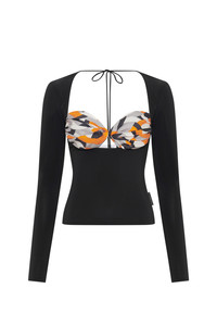 Fitted twisted top with an open neck and back Product Detail - Upcycled silk scarves twisted into bralette - Self fabric tie in back - Extra long sleeves with thumb holes - Turned hem - Branded label woven on side seam Composition and Traceability Product details page relating to environmental qualities or characteristics WTO427A UWOV0028 MU00 MULTICOLOR Composition: 92% Viscose, 8% Elastane, 100% Silk Traceability: Material sourcing and upcycling country: Italy Manufacturing: France