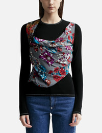 - Marine Serre - Regenerated Silk Scarves Draped Top - Multi-layered top - Crepe jersey base layer - Draped UPC silk panels upper layer with handkerchief finishing - Invisible zip on left side - Topstitched hem and cuffs with self-fabric bias - Made in France - Color and graphic on each piece are unique due to the nature of upcycling - Color: Multicolor Silk - Material: Main Fabric: 92% Viscose, 8% Elastane; 2nd Fabric: 100% Silk - See more Tops and Clothing SIZING - Model wears size XS - Model measures: Height 177cm, Chest 32”/81cm, Waist 24’’/61cm, Hip 35’’/88.9cm