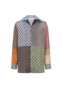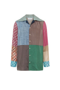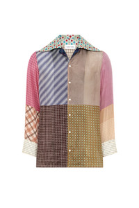 Unisex relaxed fit shirt with a flat pointy collar Product Detail - Collar finished with double topstitching - Buttoned front - Single button cuffs with pleated gathers - Side slit on right side - Back yoke - Pin hem - Upcycled silk scarves patchwork construction - Branded label woven at hem Composition and Traceability Product details page relating to environmental qualities or characteristics USI031A UWOV0028 MU00 MULTICOLOR Composition: 100% Silk Traceability: Material sourcing and upcycling country: Italy Manufacturing: France