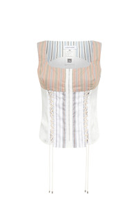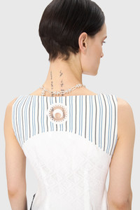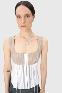 Adjustable fit regular length bustier top with an open neck and shoulder straps Crafted through an upcycling process, each piece is unique, with possible variations in shades The discount percentage displayed on Last Chance products is calculated based on the product's original selling price before markdowns. Product Detail - Hook and eye closure in front - Moon Sun stretch jersey for the lower back - Adjustable straps in front - Darted back - Crocheted Moon logo on upper back Composition and Traceability Product details page relating to environmental qualities or characteristics WTO410A DWOV0061 BG20 BEIGE Composition: Base Material: 100% Cotton - Secondary Fabric: 100% Cotton - Third Fabric: 64% Acetate, 35% Viscose, 1% Elastane Traceability: Sourcing and upcycling country: France and Italy Manufacturing: Romania