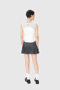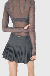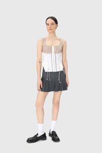 - Invisibile zip closure on side with button closure - Belt loops - Darted back - Signature Moon jacquard lining - Metallic plaque with logo in back on belt Materials Regenerated Tailoring New for this season, Moon Checks Jacquard is an RWS-certified wool jacquard that is woven in Italy and features a fusion of the Marine Serre Moon and a check pattern in neutral earth tones. Italian tailoring has strongly permeated the new collection, which has been constructed as an ode to the country’s savoir-faire. After conducting extensive research into potential new tailoring materials — always with the challenge of sourcing dormant fabrics suitable for generation — we settled upon rolls of red and grey fabric, the basis of the Regenerated Tailoring range. For men, a fitted double-breasted jacket designed for formal occasions is joined by an elongated jacket with exaggerated shoulders that’s versatile enough to appeal to women too. Women’s garments include a coat and jacket whose discreet shoulders, simple button closure and generously open neckline recall the Moon Airbrushed leather suit jacket. Sensual, lighter pieces include a strapless dress cinched above the bust by a removeable leather belt, and a pleated mini skirt. Pair it with one of the collection’s knits for a collegiate look. Main fabric: 55% Polyester, 42% Wool, 3% Elastane - Lining: 100% Viscose