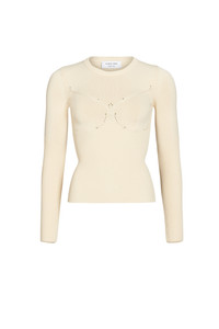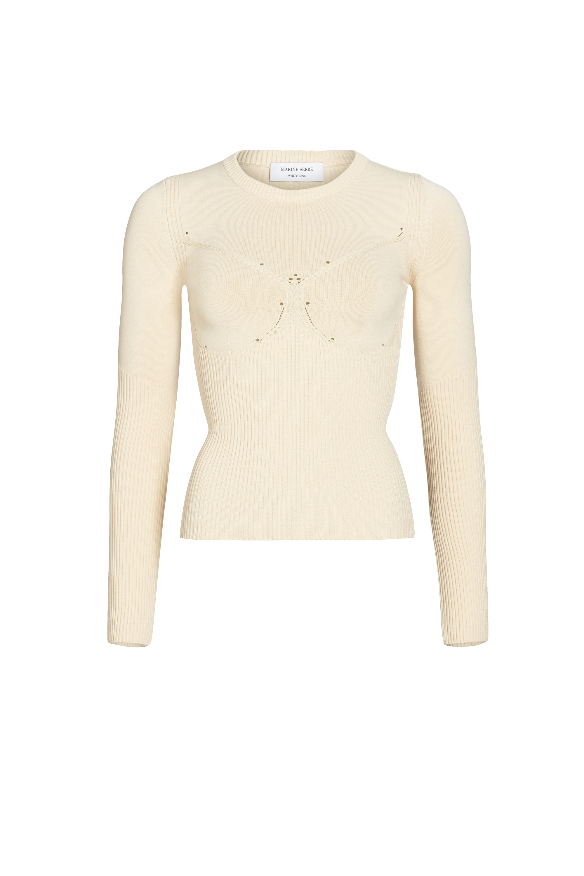 This fitted ribbed top, made from recycled fabric, showcases traveling rib details and delicate pointelle accents. The back of the top is adorned with a signature MOON pointelle design. Materials White Rib Knit The rib knit fabric pieces are crafted from recycled fabric, embracing all body type morphologies. 70% Viscose, 30% Polyester