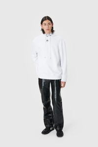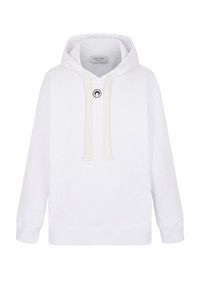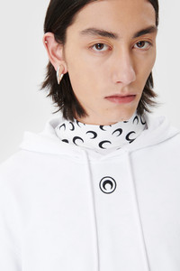 Crafted from organic cotton, this fleece hoodie showcases a seasonal tote bag print on the back and a signature Moon printed logo on the front. Materials White Organic Cotton Marine Serre’s Borderline groups all the essential layering pieces synonymous with the brand. Through a body-conscious approach, these accessible pieces sheathe the body in the shape of second skins or casual t-shirt archetypes. 100% Organic Cotton