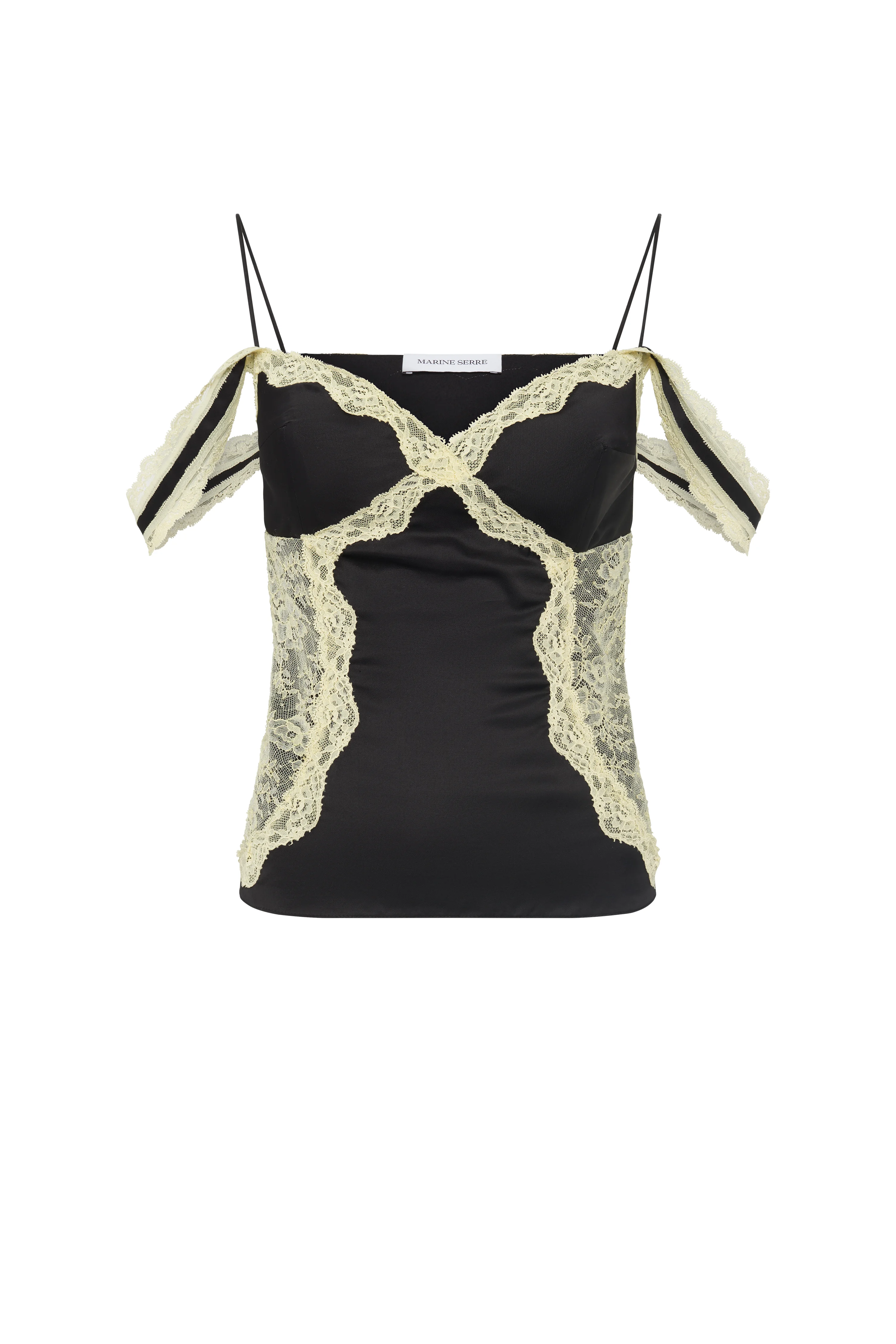 - Off-shoulder dentelle straps + small shoulder straps - Invisible zipper on the side - Off-shoulder dentelle straps - Fitted waist - Dyed crochet details - Marine Serre embroidery - Logo patch Materials DRAPED SATIN 100% VISCOSE (FSC)