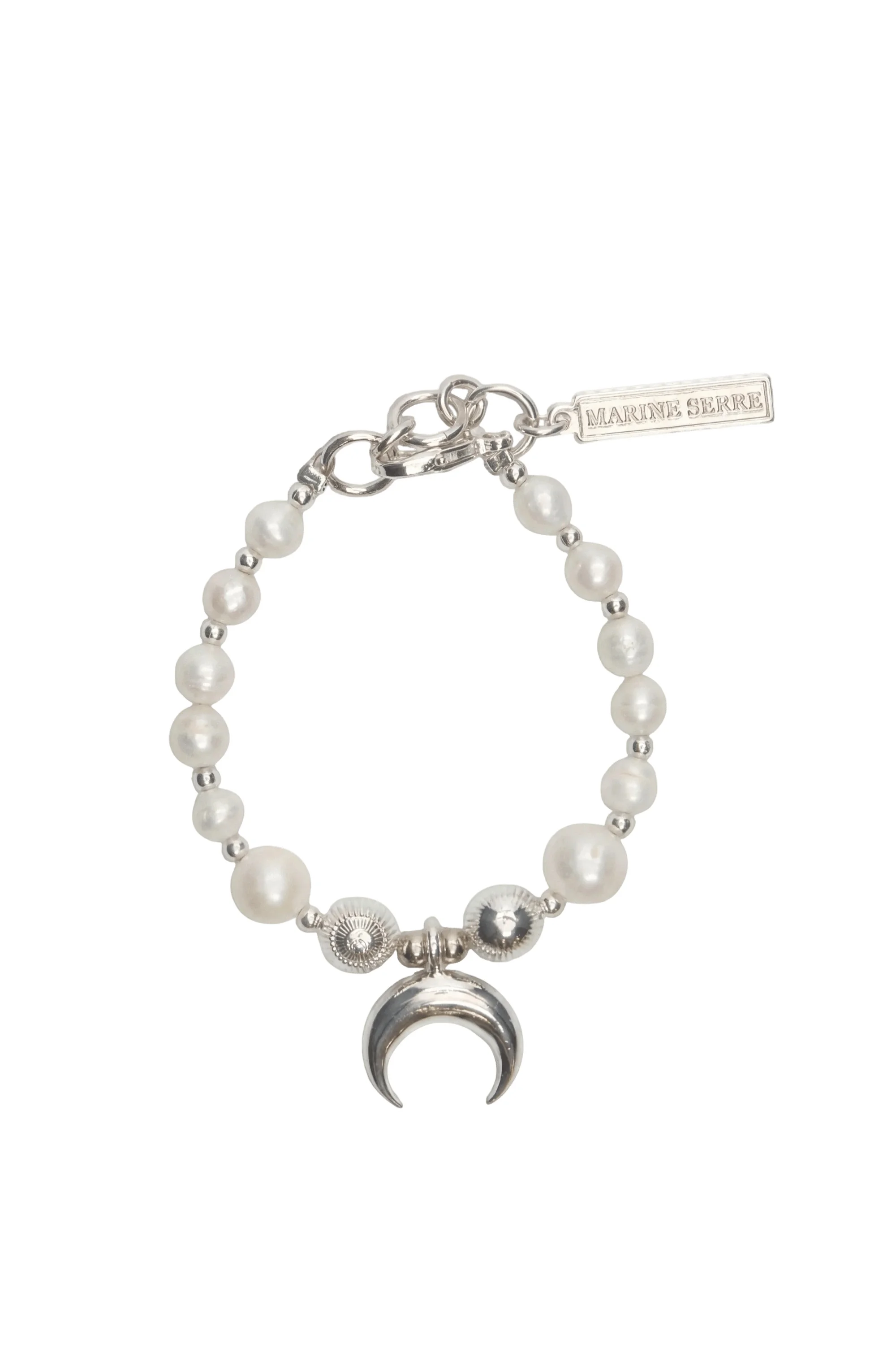Classic pearl bracelet Product Detail - Clasp - Silver plated - Moon charm Composition and Traceability Product details page relating to environmental qualities or characteristics UBR002A_RMET0001_MT11_SHINY_SILVER Composition: Base Material: 100% Brass - Plating: 100% Silver Avoid contact with water, cosmetics, perfumes, or any other toxic product. Traceability: Manufacturing: France