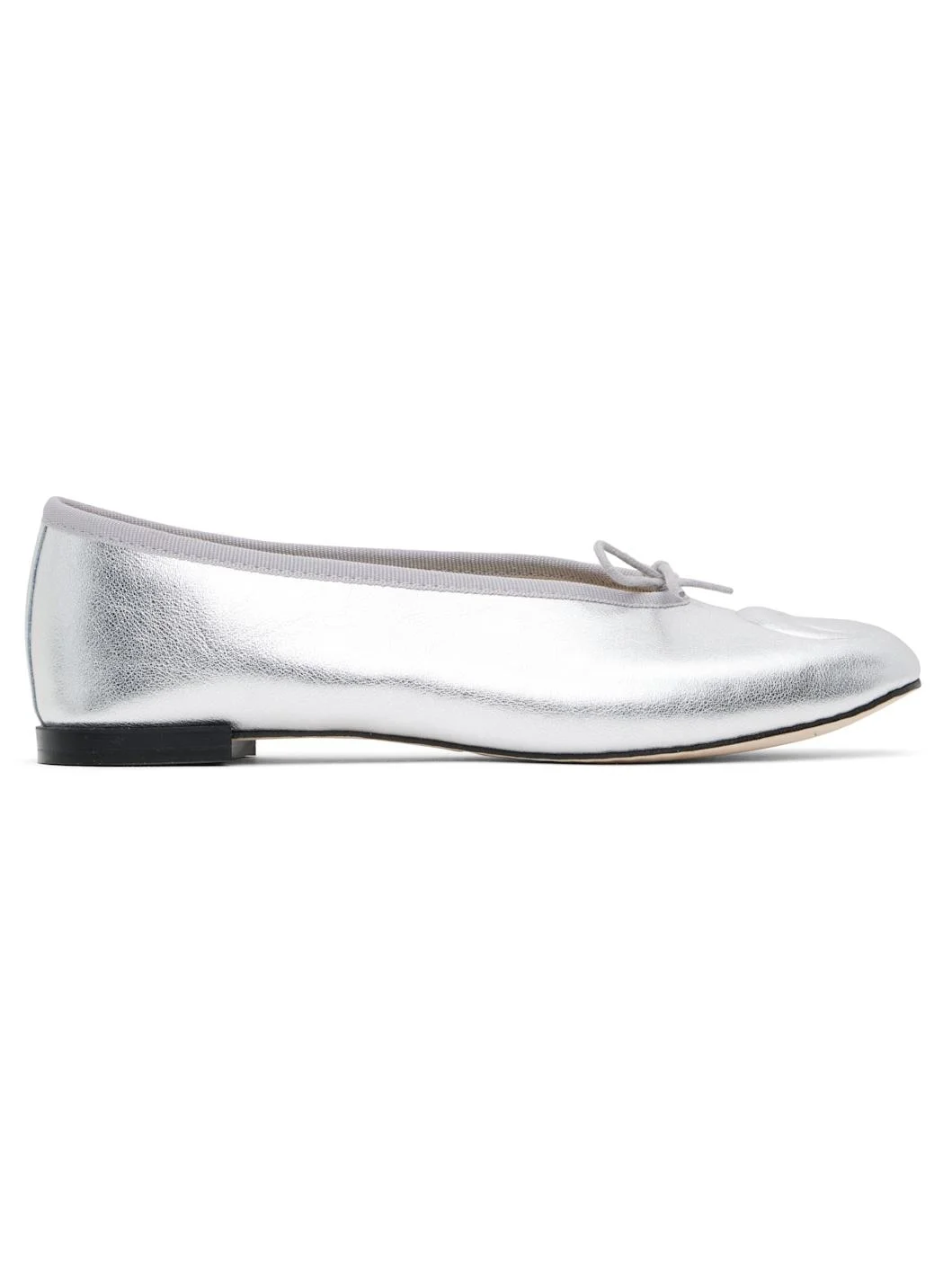 LWG-certified nappa calfskin ballerina flats in silver tone. · Logo embossed at toe · Bow accent at vamp · Grosgrain trim at collar · Cotton twill lining · Stacked leather heel with rubber injection · Nubuck sole Part of the Marine Serre x Repetto collaboration. Supplier color: Silver Upper: calfskin. Sole: leather, rubber. Made in France 251020F118002