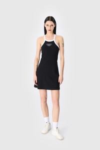 - Contrasted white ribbed shoulder strap - MARINE SERRE Six Moons Logo embroidered on front - Black MARINE SERRE branded label stitched on upper back below collar - Cover stitching along hem with self-fabric bias finish Materials Black Organic Cotton All of the cotton that Marine Serre sources for the BORDERLINE collection is certified GOTS (Global Organic Textile Standard). This certification is the worldwide leading textile processing standard for organic fibers and provides credible assurance of responsible manufacturing with the least chemical inputs. In terms of shapes, the House proposes a wide range of everyday styles taken directly from the sportswear universe. 95% Organic Cotton, 5% Elastane