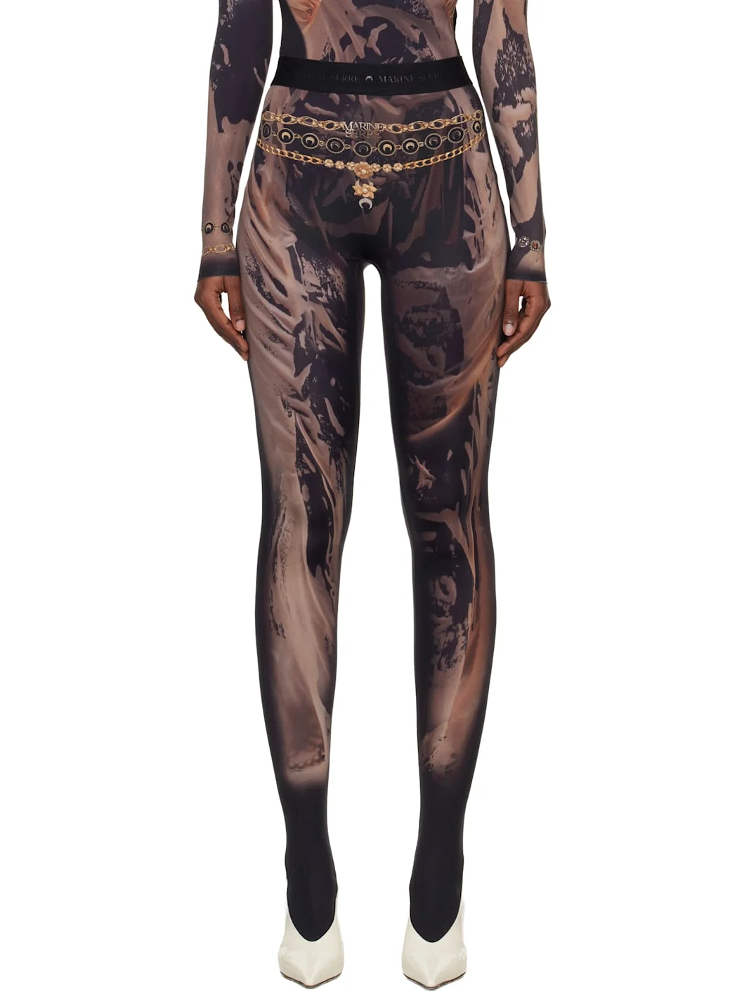 Stretch jersey leggings. · Certified OEKO-TEX® and GRS recycled nylon · Trompe l'oeil graphic throughout · Mid-rise · Logo-woven elasticized waistband · Integrated feet · Logo printed at back waistband Available exclusively at SSENSE. Supplier color: Tan wet nuisette printed 88% recycled polyamide, 12% recycled elastane. Made in Portugal 252020F110020