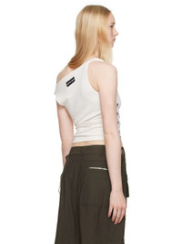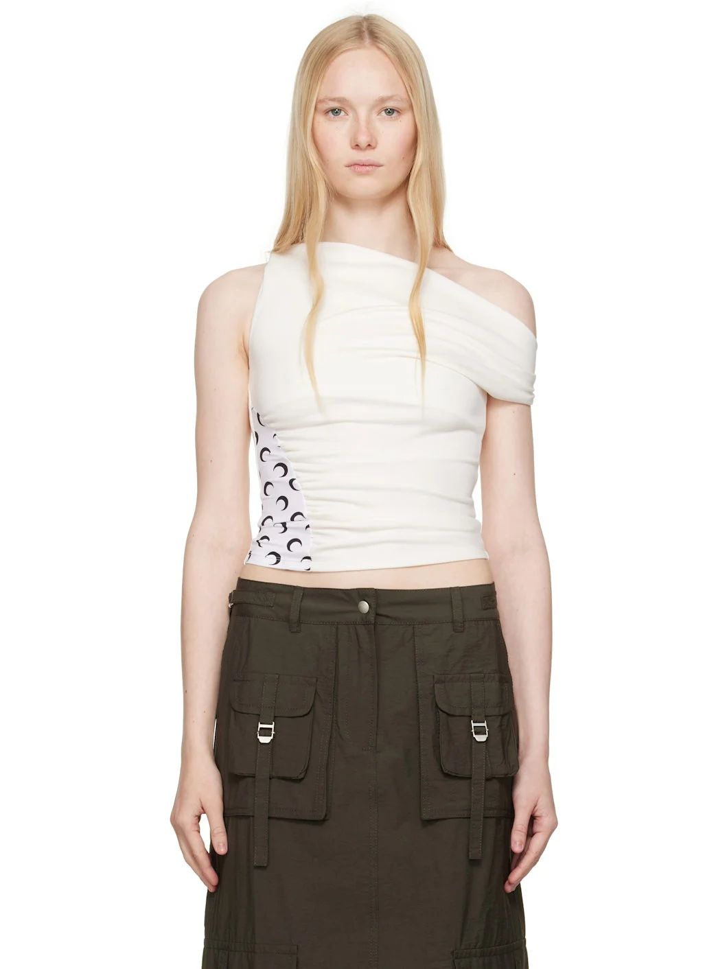 Lyocell- and silk-blend jersey top. Draping throughout. · Asymmetrical off-the-shoulder construction · Gathering and printed logo pattern at side · Twisted detailing at shoulder · Logo patch at back collar Available exclusively at SSENSE. Supplier color: Optical white Body: 90% lyocell, 10% silk. Trim: 88% polyamide, 12% elastane. Made in Portugal 251020F111019