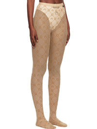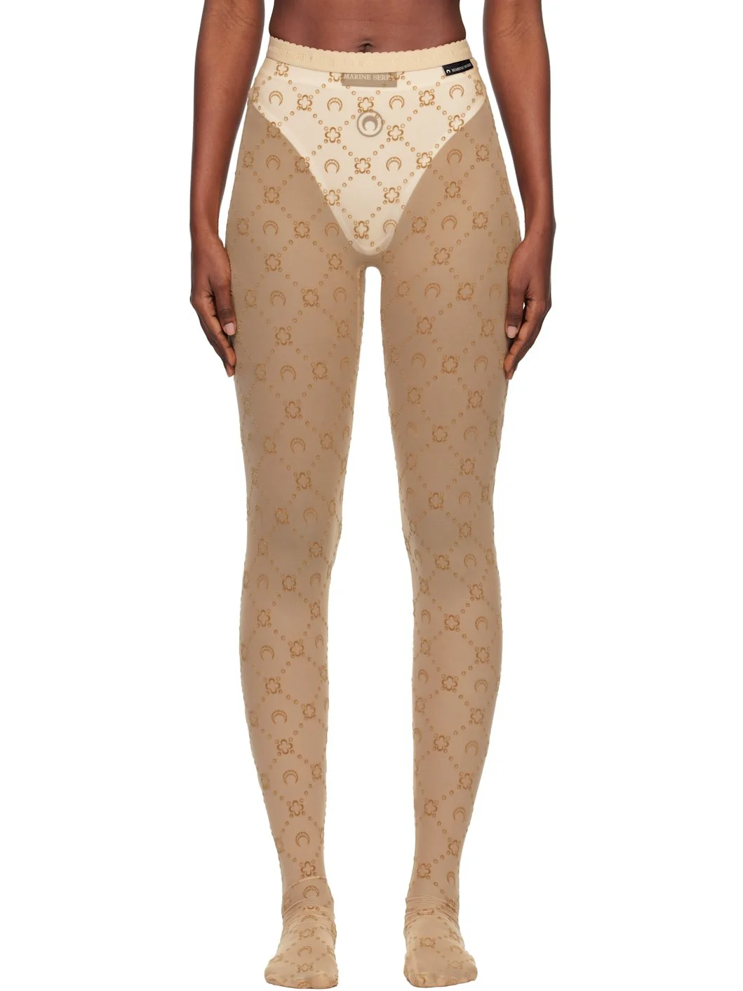 Sheer stretch recycled nylon mesh tights. · Logo pattern flocked throughout · High-rise · Scalloped edge at logo-woven elasticized waistband · Logo flag at front Supplier color: Moonogram flock mesh camel 86% recycled polyamide, 14% elastane. Made in France 252020F076002