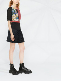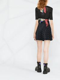 twisted-scarf hybrid knit top Marine Serre adds three silk scarves to the front of this black knitted top for SS22. Designed in Italy, the layered silhouette features draping and self-tie fastenings allowing for a unique fit on each wearer. Made in Italy Composition Viscose 100%, Silk 100% SIZE & FIT Model measurements Height 5 ft 10 in(1.78 m) Bust/Chest 31.49 in(80 cm) Hips 35.43 in(90 cm) Waist 24.4 in(62 cm) FittingInformation This piece fits true to size. We recommend you get your regular size Cut for a slim fit Made with a mid-weight fabric Washing instructions Dry Clean Only