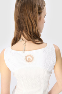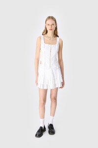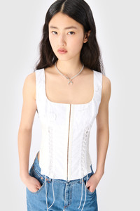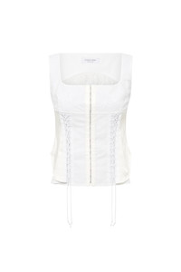 Sleeveless corset top Product Detail - Hook and eye closure in front - Pillowcase lacing for the front and sleeves - Moon Sun stretch jersey for the lower back - Decorative straps in front - Darted back - Crocheted logo in upper back Composition and Traceability Product details page relating to environmental qualities or characteristics WTO410A_UWOV0007_WH10_WHITE Composition: Base Material: 100% Cotton - Secondary Fabric: 100% Cotton Traceability: Material sourcing and upcycling country: France Manufacturing: Romania