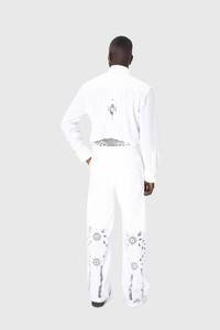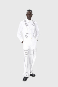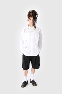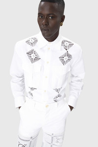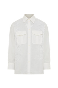 Unisex shirt with long sleeves Product Detail - Seven button front - Tailored sleeves with plackets and two button cuffs - Pleated gathers on bottom of sleeve cuffs - Twin extra-large army pleated pocket in front - Back yoke with back pleats - Logo embroidered on twin pockets Composition and Traceability Product details page relating to environmental qualities or characteristics USI022A_UWOV0045_WH20_OFF_WHITE Composition: Base Material: 100% Cotton - Secondary Fabric: 100% Cotton Traceability: Material sourcing and upcycling country: France Manufacturing: Romania