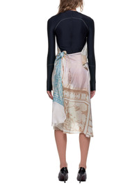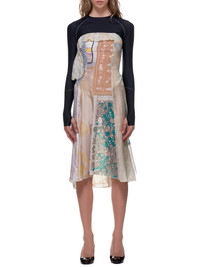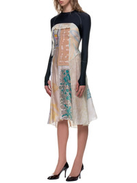 Marine Serre upcycled silk scarves dress in white/multicolor, rounded neckline, long tapered sleeves, rear zippered closure, vented rear hip cut-out panel,attached multicolor skirt constructed of upcycled silk scarves, adjustable waist with rear drawstring closure, asymmetrical hem, tonal stitching. Note: This article is made from upcycled vintage fabrics, and as such any imperfections present are inherent and unique characteristics. Made in Italy. Composition - 100% Silk (Main), 78% Polyamide, 22% Elastane Model is 5ft 9” and wearing a size S. Bust: 32” Waist: 23” Hip: 32”