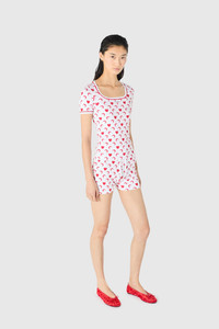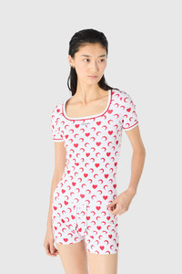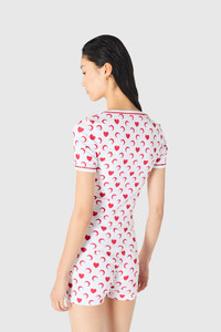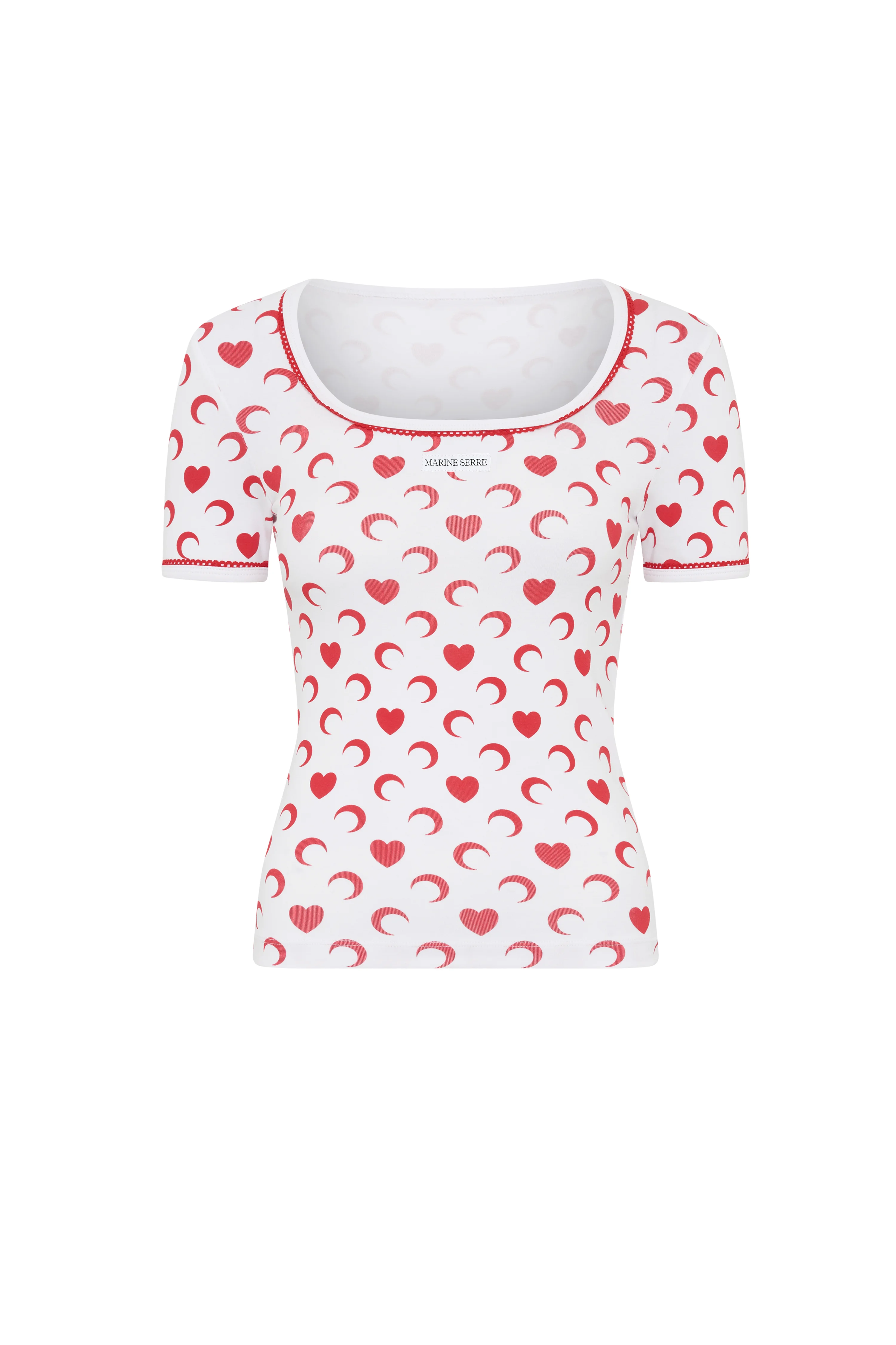 Regular length top with square neck and short sleeves Product Detail - Ribbed collar - Woven logo label - Scalloped tape finishing at collar and sleeve hems - Digital print all over - Valentine's Day Capsule Composition and Traceability Product details page relating to environmental qualities or characteristics WTT034A_CJER0119_WH17_WHITE/RED Composition: 95% Cotton, 5% Elastane Traceability: Weaving, Dyeing, Manufacturing: Turkey