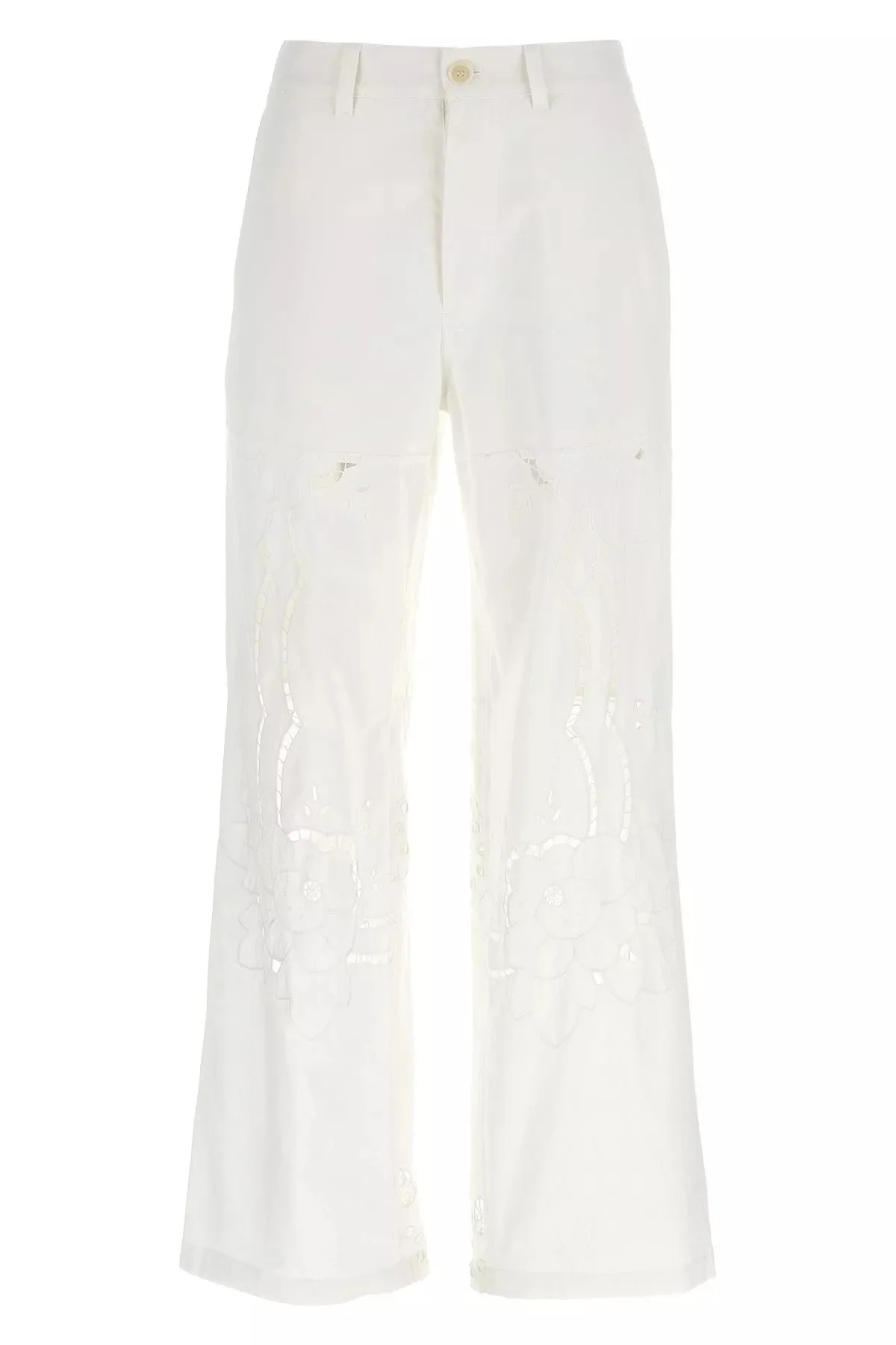 cod. UPA056AUWOV0007WH10 Cotton pants with embroidery and cut-out details, front button closure, pockets, wide leg. SUSTAINABLE: Product made with regenerated materials. Color: White Size & Fit: Relaxed fit Composition: 100% cotton Made in: Romania
