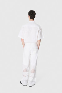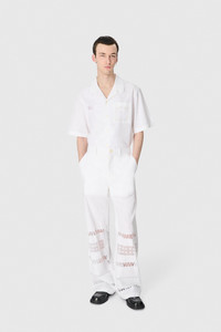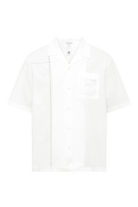 Unisex shirt with short sleeves, square cut with flat collar Product Detail - Buttoned front - Applied pocket on left breast - Back yoke - Upcycled household linen embroideries in front - Pin hem - Lace branded patch embroidered on front pocket Composition and Traceability Product details page relating to environmental qualities or characteristics USI016A_UWOV0007_WH10_WHITE Composition: Base Material: 100% Cotton - Secondary Fabric: 100% Cotton Traceability: Material sourcing and upcycling country: France Manufacturing: Romania