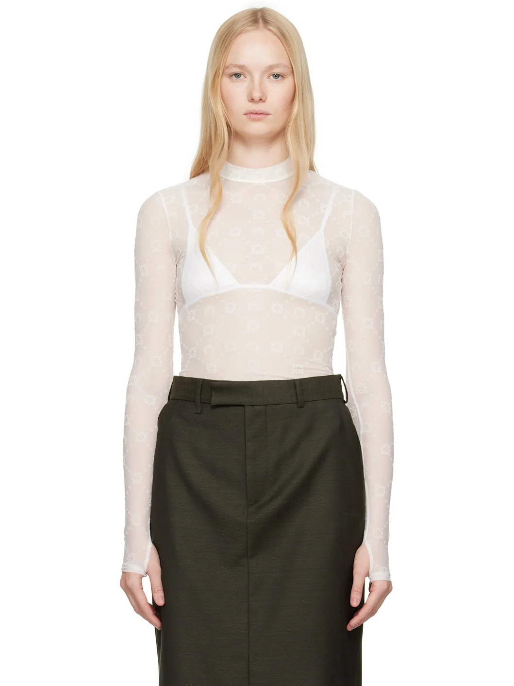 Semi-sheer stretch recycled nylon mesh T-shirt. Logo pattern flocked throughout. · Mock neck · Logo flag at side seam · Thumbhole at cuffs Supplier color: Off white 86% recycled polyamide, 14% elastane. Made in France 251020F110044