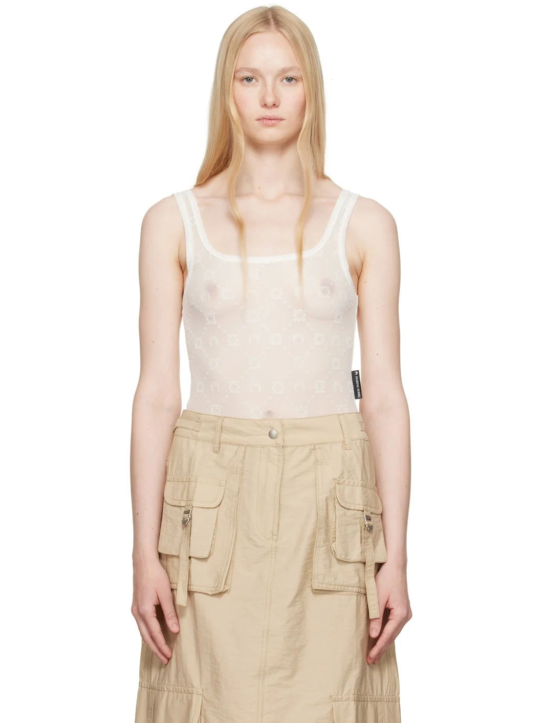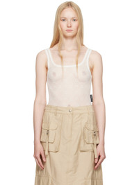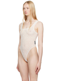 Stretch recycled nylon mesh bodysuit. Logo pattern flocked throughout. · GRS-certified nylon · Scoop neck · Press-stud fastening at bottom · Logo flag at side seam · Low back Supplier color: Off white 86% recycled polyamide, 14% elastane. Made in Italy 251020F358000
