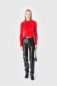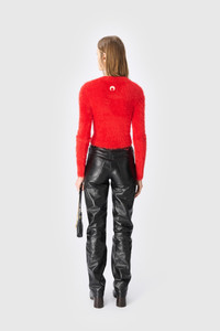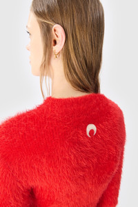 - Double layered ribbed neckline - Fluffy knit - Size adaptable - Signature Moon patch below neck in back Materials Puffy Knit Red The Wild Puffy Knit is perhaps the most treasured knit of Marine Serre. It was first presented in RISING SHELTER and has been part of every collection since. It was directly inspired by sweaters Marine’s grandmother would knit for her and her sister. After establishing her House, it was important for Marine to pay homage to her grandmother and her adolescence by reproducing her favorite childhood knit in her collections. 100% Polyester