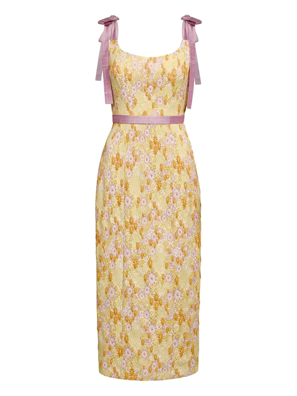 Acacia belted brocade corset dress Highlights - Yellow - Floral brocade - Ribbon straps - Belt - Corset - Rear zip fastening Made in United States Composition Outer: Polyester 73%, Rayon 23%, Spandex/Elastane 4% Lining: Silk 100%
