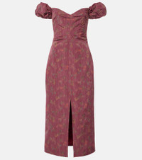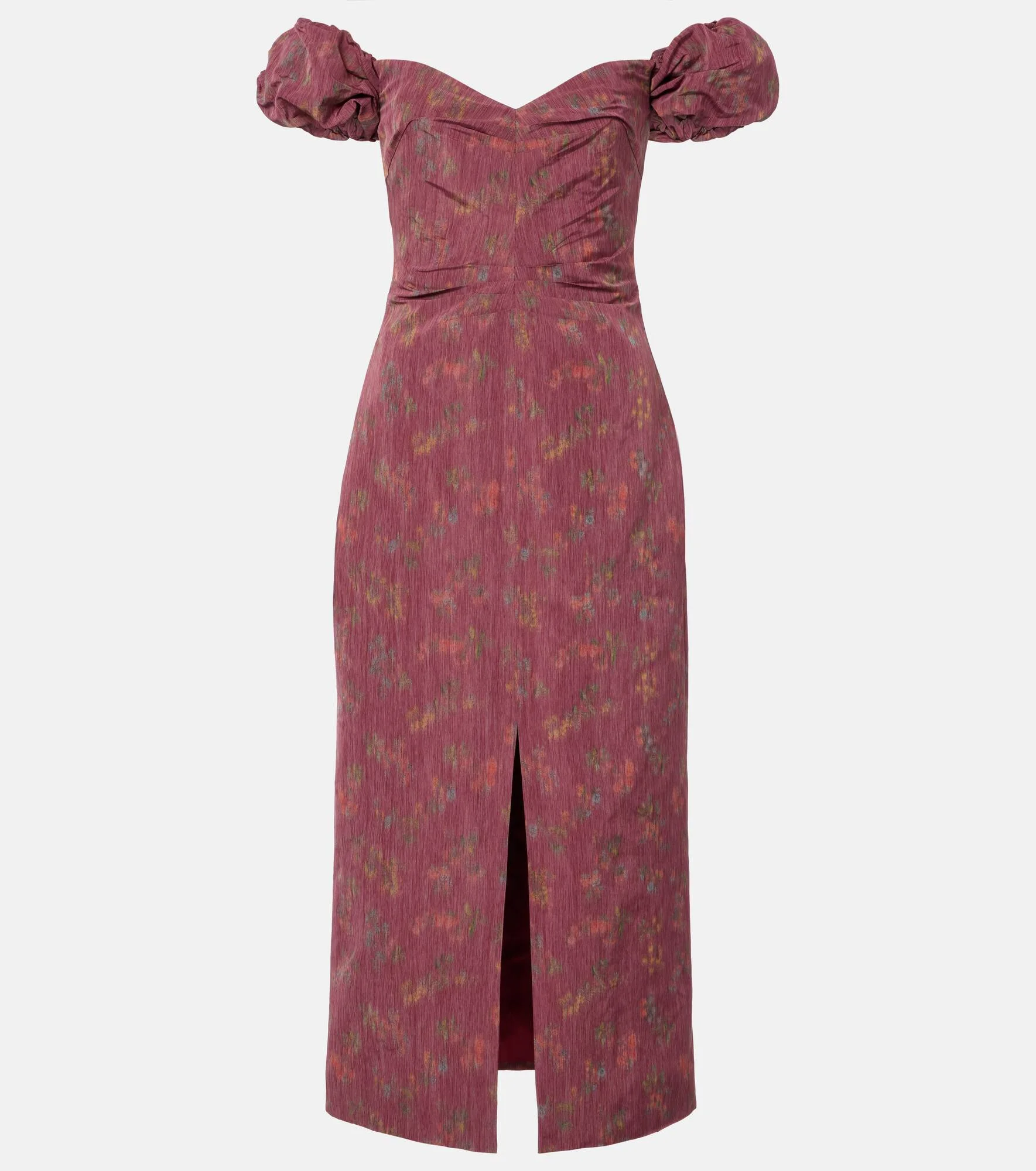 The Adelaine gown by Markarian is defined by an elegant silhouette with voluminous puff sleeves and off-shoulder styling. Adorned with a floral motif all over, the style exudes timeless charm. Product Details - Material: 100% polyester - Care instructions: dry clean - Made in the USA - Designer color name: Raspberry Floral Ikat - Item color: burgundy, multicolor - Lining: 100% silk - Boning - Closure: zipped back - Cuff: elasticated - Long vent - Item number: P01094025 Size & Fit - True to size - Low back - Off-the-shoulder - Internal boned corset for support - Cinched waist - Non-stretchy fabric - slit length 42,0cm-16.5" - The model seen in the picture is 178cm-5'10" and wearing a size US 4