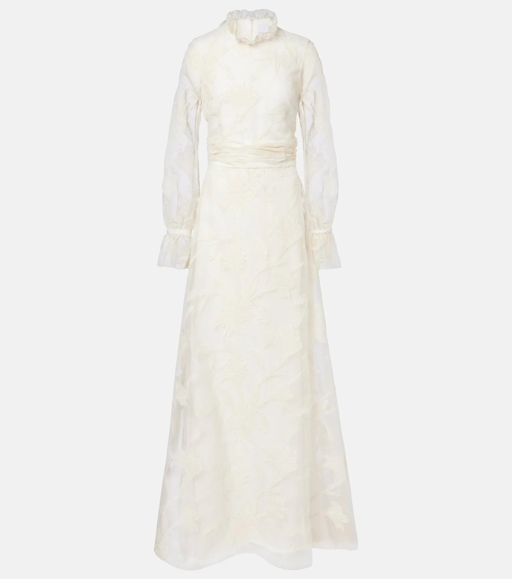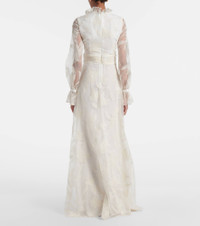 Special events call for charming designs like the Adeline bridal gown from Markarian. Crafted from silk organza, its design features sheer poet sleeves and a ruffled neck and is finished with all-over floral embroidery. Product Details - Material: 100% silk - Care instructions: dry clean - Made in the USA - Designer color name: Ivory - Item color: white - Lining: 100% silk - Closure: concealed zipper, zipped back, hook fastening - Item number: P01052012 Size & Fit - True to size - Cinched waist - Non-stretchy fabric - The model seen in the picture is 178cm-5'10" and wearing a size US 4