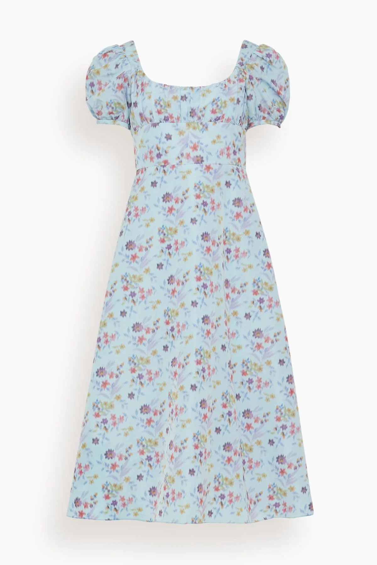 Elora Ikat Puff Sleeve A-Line Midi Dress in Blue and Pink Floral