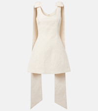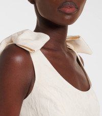 Crafted from fine brocade, the Gita minidress from Markarian is a minimalist design finished with voluminous bow details on the shoulder straps and oversized ribbons falling on the back. Product Details - Material: 62% polyester, 24% cotton, 14% acrylic - Care instructions: dry clean - Made in the USA - Designer color name: Ivory - Item color: ivory - Lining: 100% silk - Closure: zipper, hook fastening - Contains non-textile parts of animal origin - Item number: P01052007 Size & Fit - True to size - Cinched waist - Loose outer layer - Non-stretchy fabric - The model seen in the picture is 178cm-5'10" and wearing a size US 4