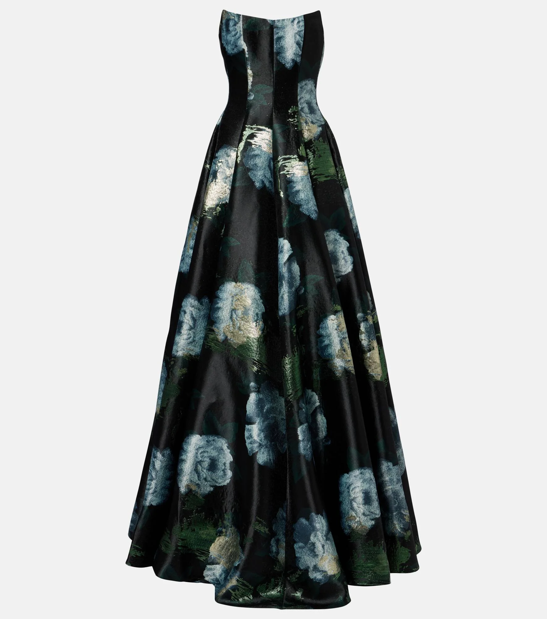 Markarian channels celestial glamour through couture-level silhouettes and a distinctly romantic perspective. The Laila brocade gown is adorned with a floral motif all over and features a corset bodice that flows into a flared, voluminous skirt. Product Details - Material: 86% polyester, 14% metallic fibres - Care instructions: dry clean - Made in the USA - Color: green - Designer color name: Metallic Watercolor - Item color: green, multicolor - Lining: 100% silk - Boning - Closure: invisible zipper - Item number: P01141044 Size & Fit - True to size - Ideal fit for larger bust sizes - Strapless - Internal boned corset for support - Cinched waist - Non-stretchy fabric - The model seen in the picture is 178cm-5'10" and wearing a size US 4